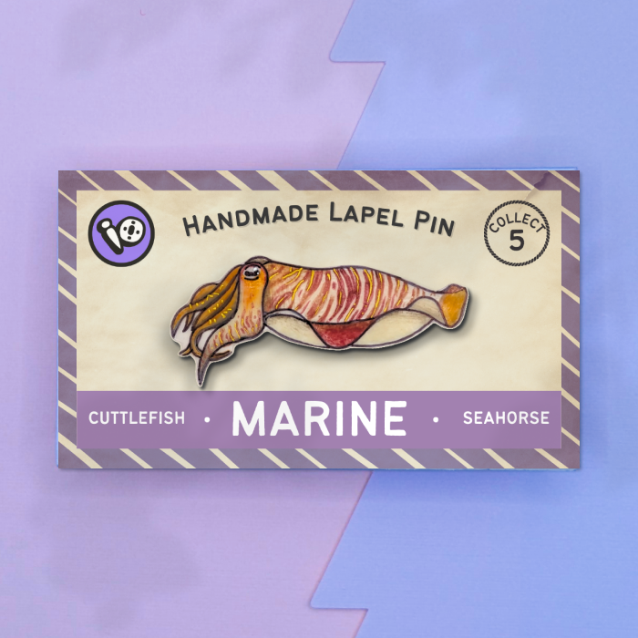 Lapel Pin: Wear your admiration for the Cuttlefish with our charming lapel pin, perfect for adding a touch of aquatic flair to any outfit.