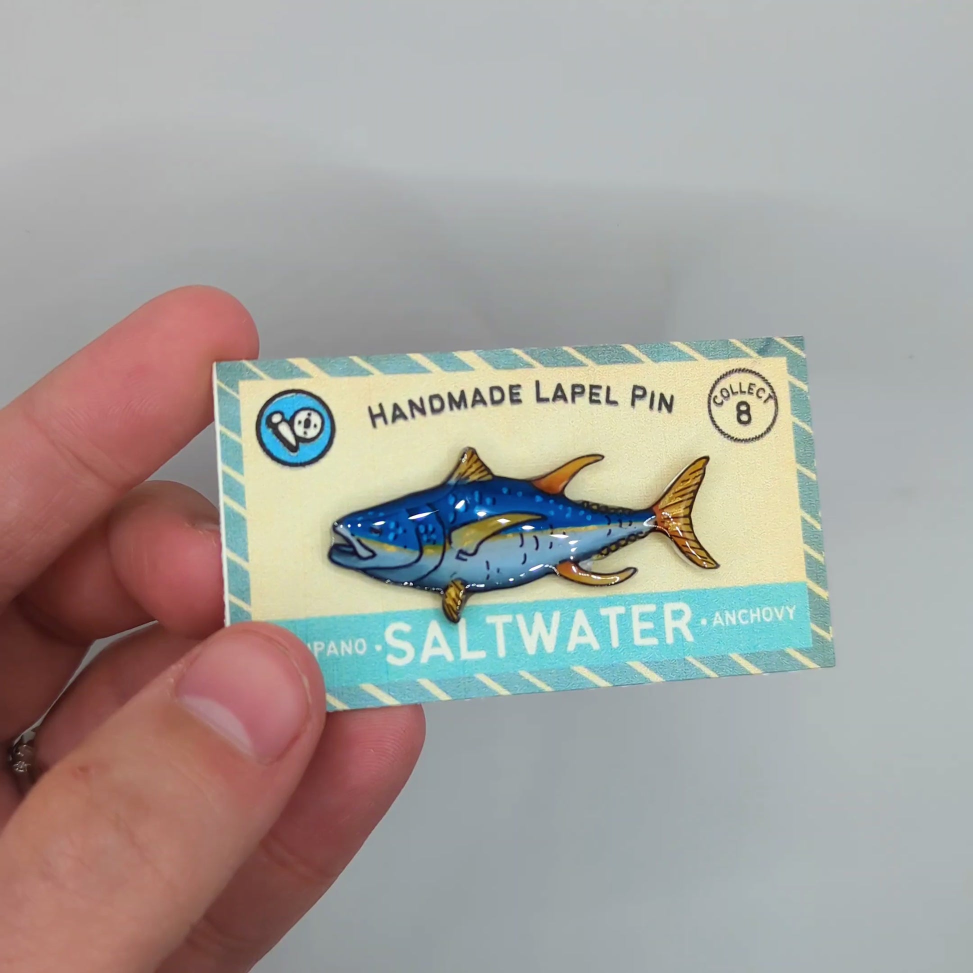 Lapel Pin: Wear your admiration for the Yellowfin Tuna with our charming lapel pin, perfect for adding a touch of aquatic flair to any outfit.